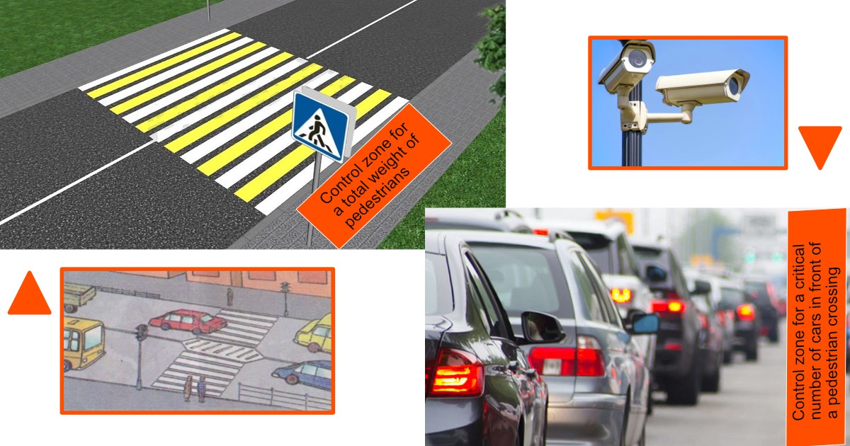 1. The "Control zone for a total weight of pedestrians" - an area in front of the crossing, that will collect the weight of all pedestrians are staying simultaneously in its perimeter. The computer analyzes the collected data, comparing it with the data received from the "Control zone for a critical number of cars in front of a pedestrian crossing" and decides when to turn the green light on. For example, 10 people are waiting to cross the street and there is no huge traffic, it can be counted 1 second for 1 person. So, the green light will turn on in 10 seconds.