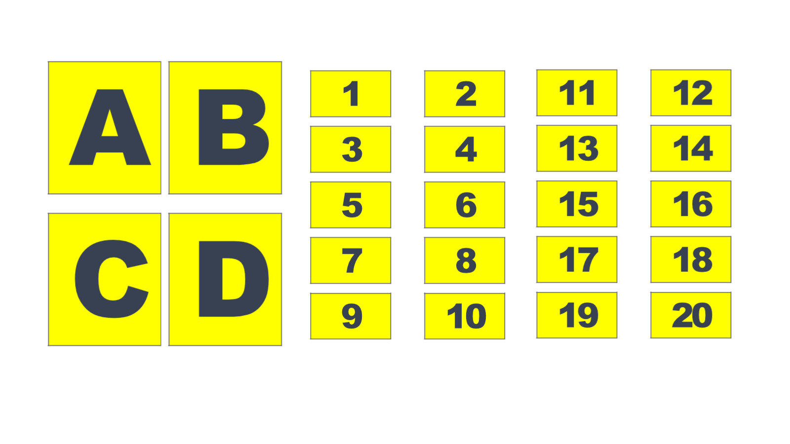We had four three-store shelves, each of which I labeled at the top on both sides, at the beginning and at the end of the row (rows A, B, C, and D were formed). Above each niche (spot) that holds one pallet, I stuck a number (from 1 to 20).